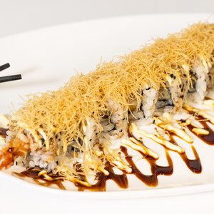 Riso, aceto di riso, sesamo, alga, gambero impanato e pasta kataifi, mayonese e in superficie salsa teriyaki. La porzione intera è formata da 8 maki.