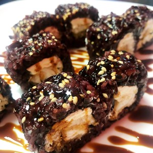 riso venere con all’interno orata cotta in tempura e philadelphia e in superficie semi di sesamo e salsa teriyaki.