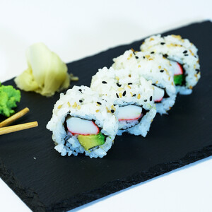 Riso, aceto di riso, sesamo, alga nori, polpa granchio, avocado