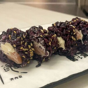 Riso venere, aceto di riso, sesamo, alga nori, salmone, philadelphia