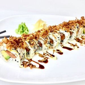 Con interno salmone avocado e in superficie cipolla fritta e sesamo più salsa teriyaki e maionese. Porzione da 8 pezzi.