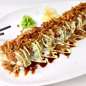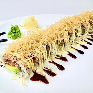 Con interno salmone, avocado e in superficie pasta kataifi e sesamo più salsa teriyaki e maionese. Porzione da 8 pezzi.