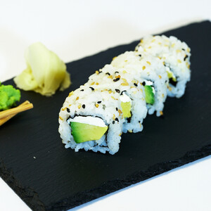Riso, aceto di riso, sesamo, alga nori, avocado e philadelphia.