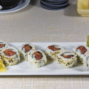 uramaki con tonno cotto sott’olio avocado e maionese. Una porzione comprende 8 pezzi.