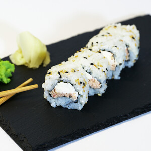 Con interno salmone, philadelphia e in superficie pasta kataifi e sesamo più salsa teriyaki e maionese. Porzione da 8 pezzi.
